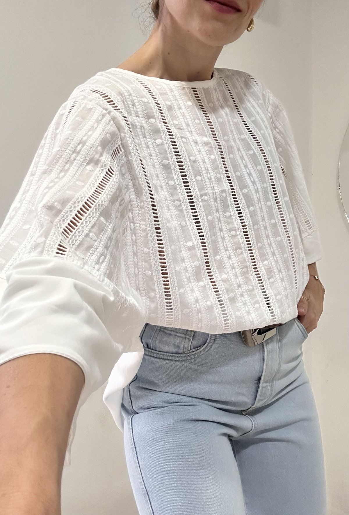 Blusa de corte amplio espalda de poplin con cartera y frente en broderie