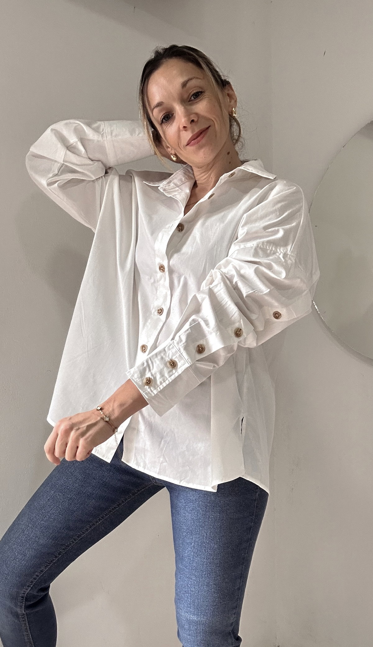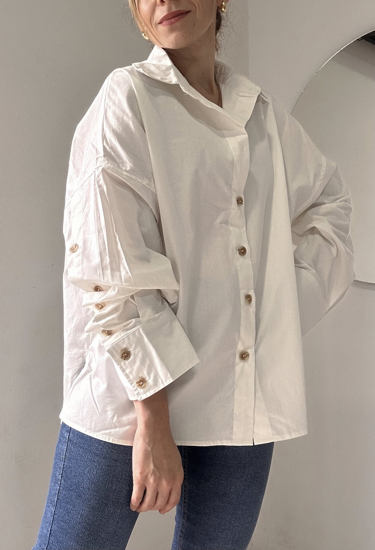 Camisa Over bien amplia de poplin camisero importado con detalle de botones en mangas