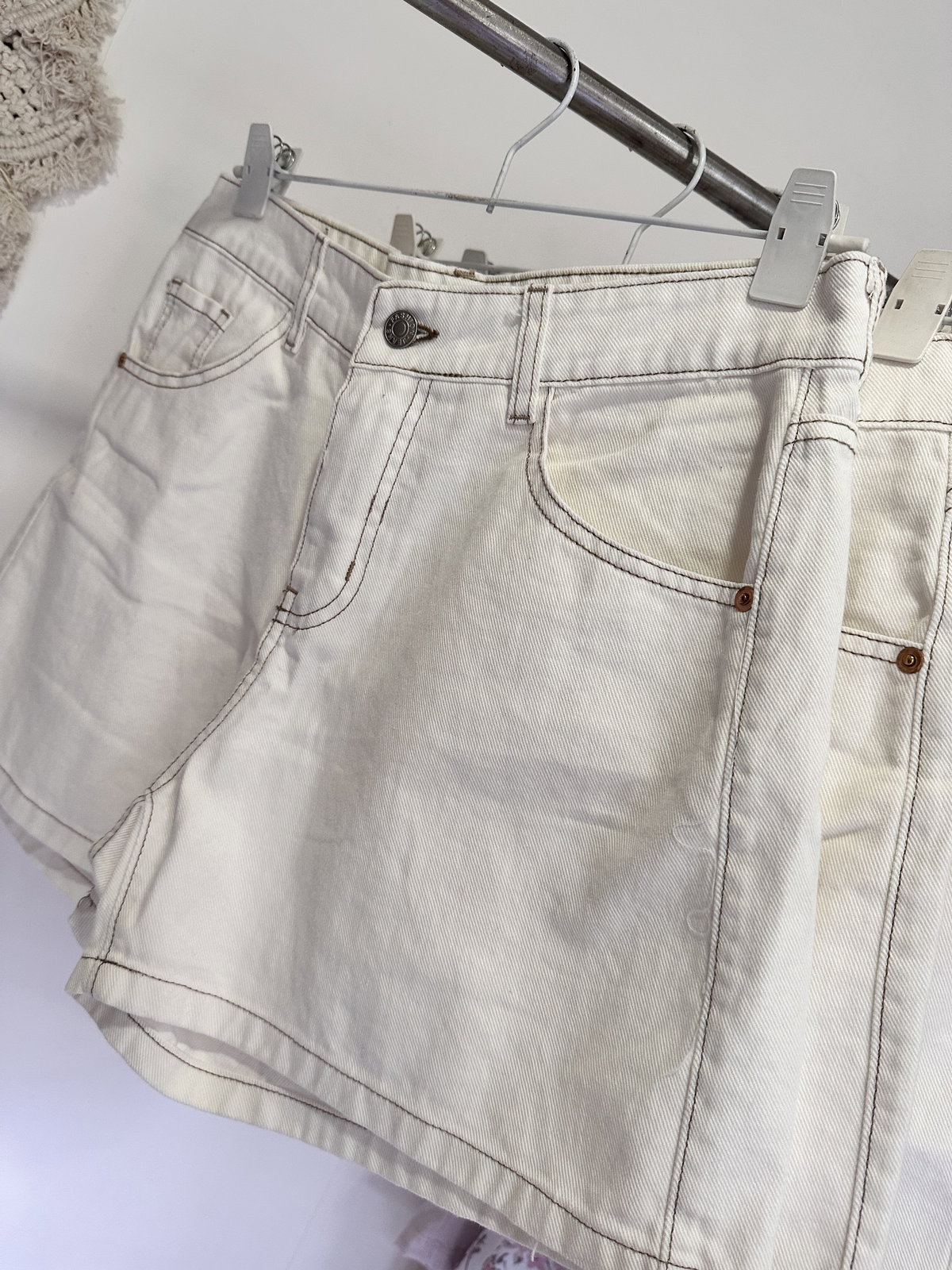 Short de Jeans color off white con pespuntes color camel. Molderia grande.