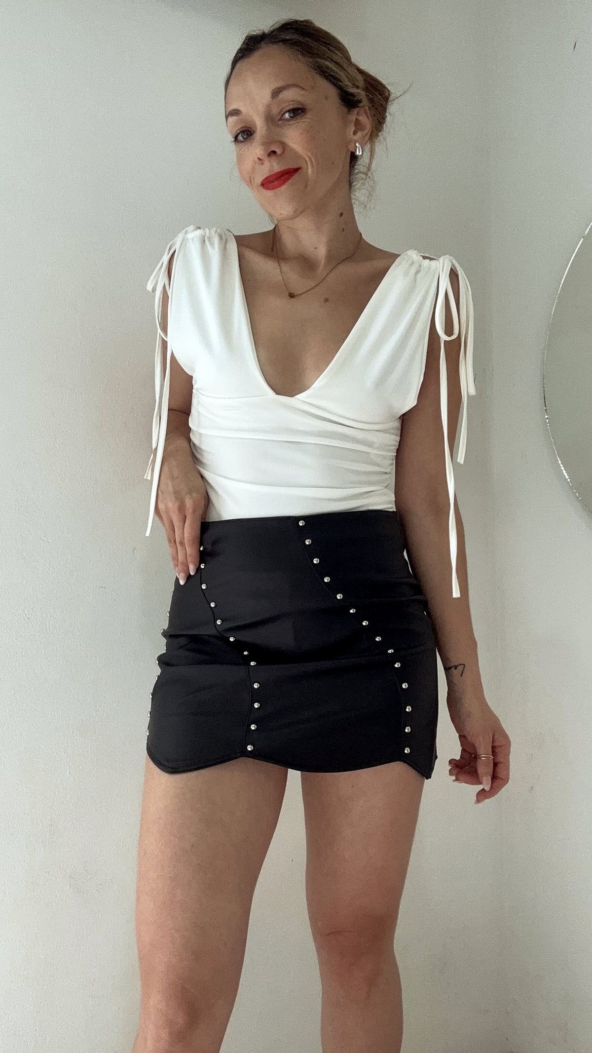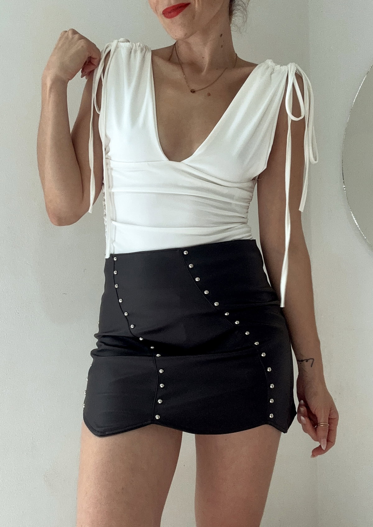 Mini falda importada de eco cuero elastizado, con apliques de tachas, cierre invisible. Talle 36/38
